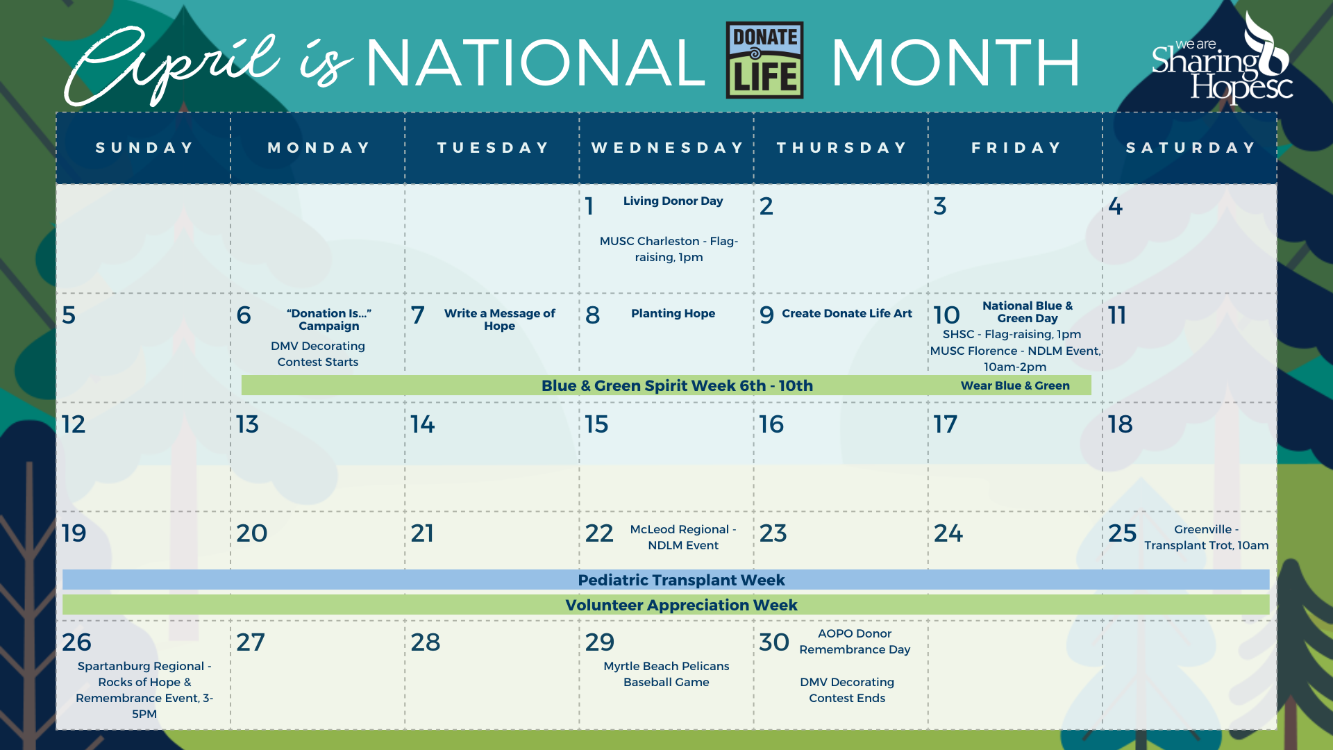 Join the partners, volunteers, SCDMV offices, and surrounding hospitals by taking part in the many Donate Life activities. We invite you to share the community spirit by wearing blue and green and spread the word through social media. Check this page often to learn more details on planned events. Contact Krystal Cau at cauk@donatelifesc.org if you would like to share your story.
