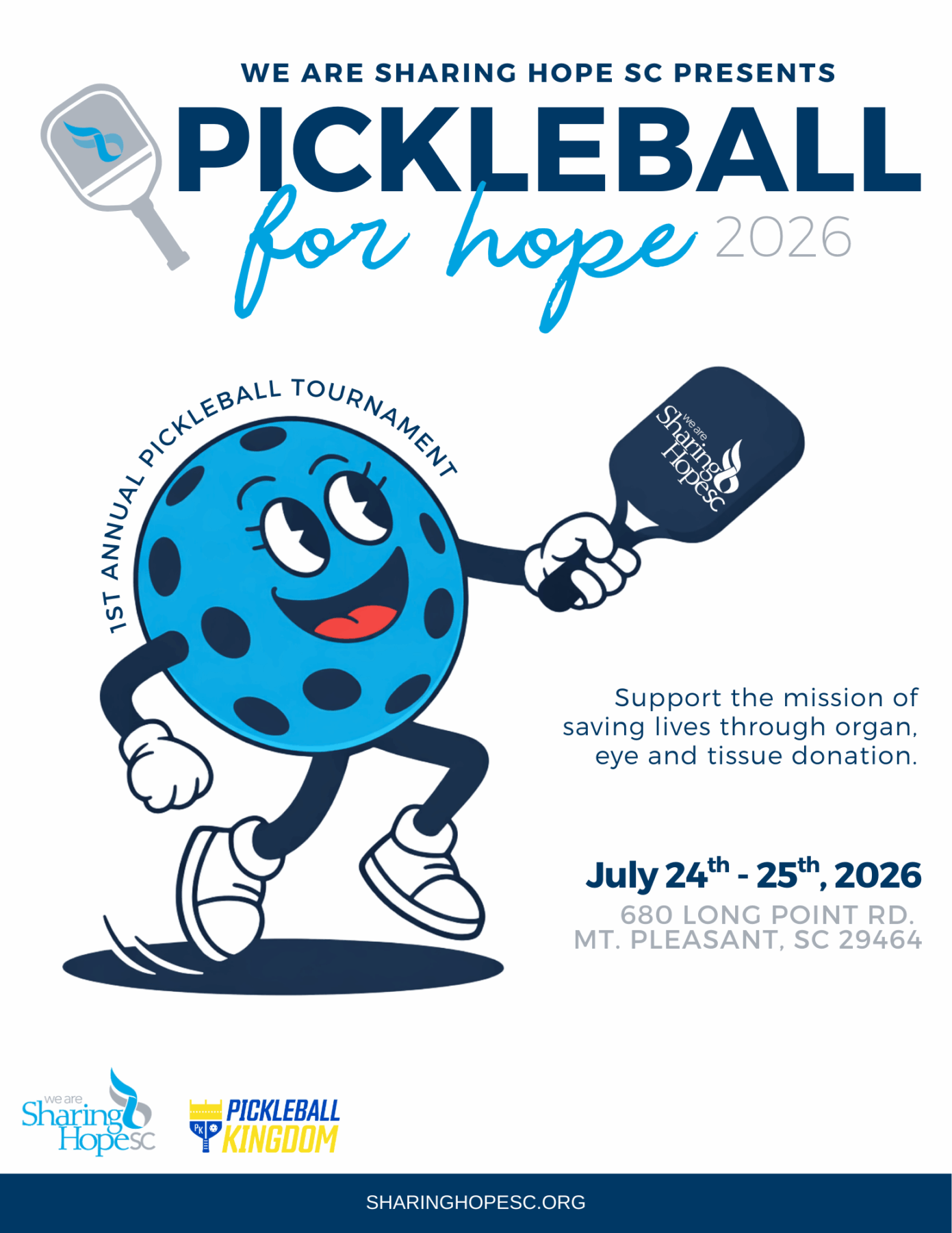Pickleball for Hope is We Are Sharing Hope SC’s new annual fundraising tournament bringing transplant recipients, donor families and community members together in a shared celebration of life and legacy. Through friendly competition and meaningful connection, participants honor donor heroes who gave the greatest gift, the gift of life.